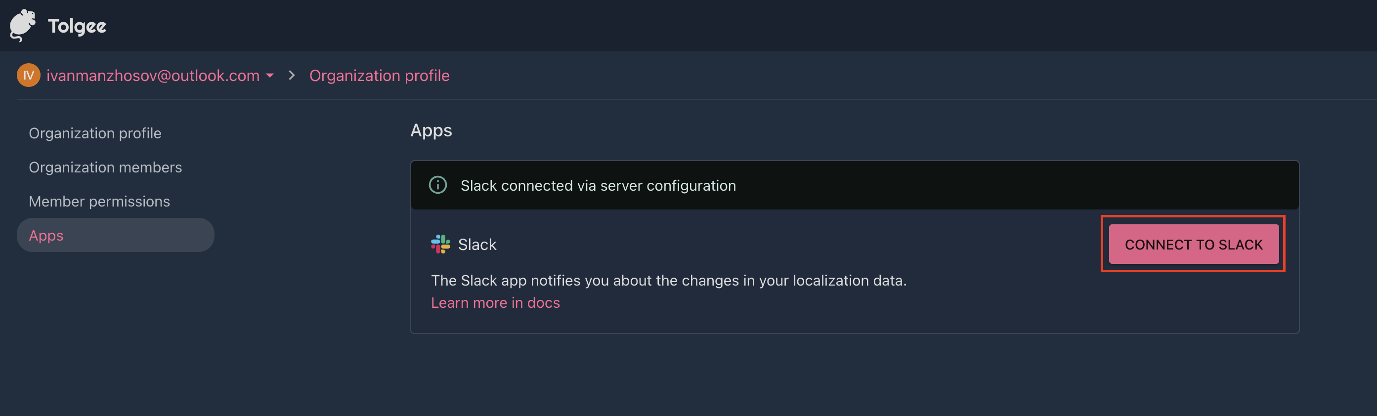 Now you need to link your Tolgee account with your Slack account. We need this to identify you and provide you with the necessary permissions. Here is how you can do that: