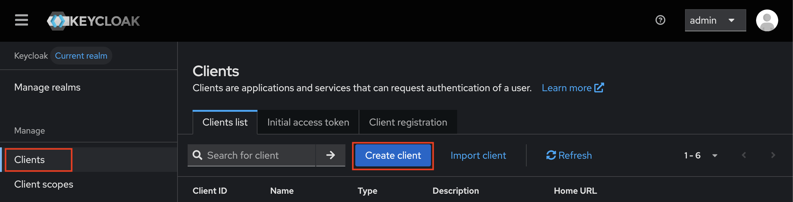 To enable SSO with Keycloak, you first need to create a client in your Keycloak instance. Log in to Keycloak, choose the correct Realm, then navigate to Clients and click Create client.