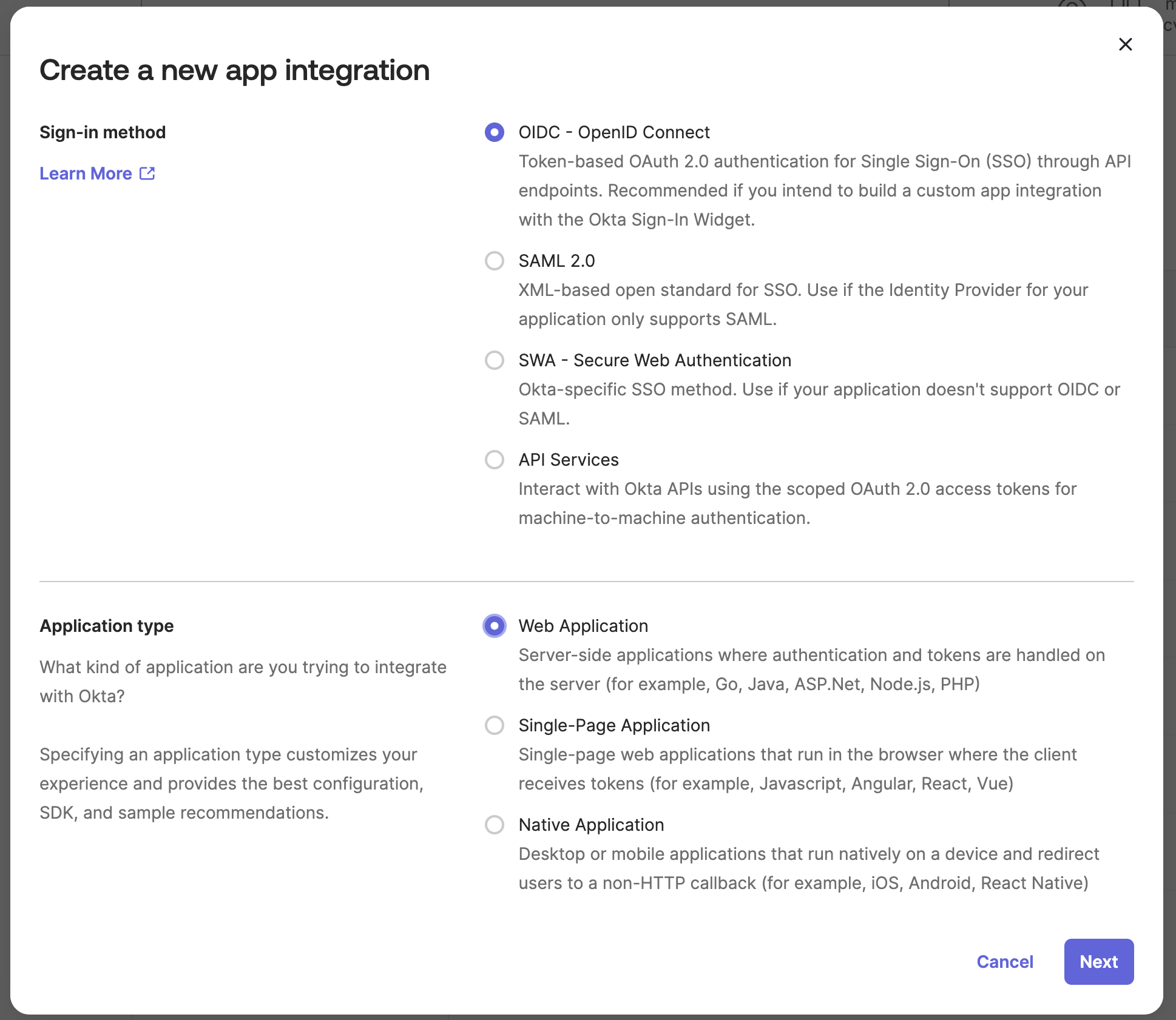 Now select OIDC - OpenID Connect as the Sign-in method and Web Application click Next.